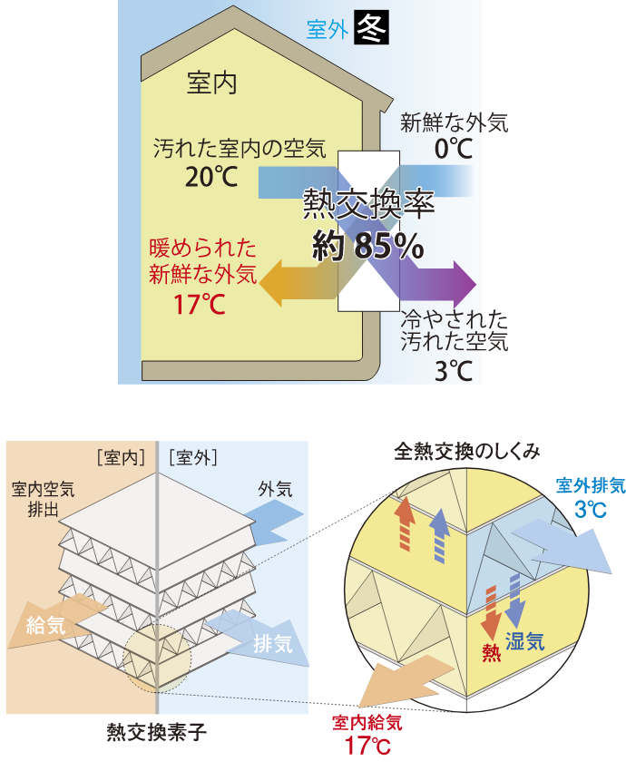 全熱交換型24時間換気システム 「健康空気」を室温に近づけて確実に供給し、同時に室内の汚れた空気は熱交換して屋外に排出する全熱交換型換気システムです。外気を室内の温度・湿度に近づけて取り入れるので、お部屋の快適性を維持しながら24時間計画換気を実現します。